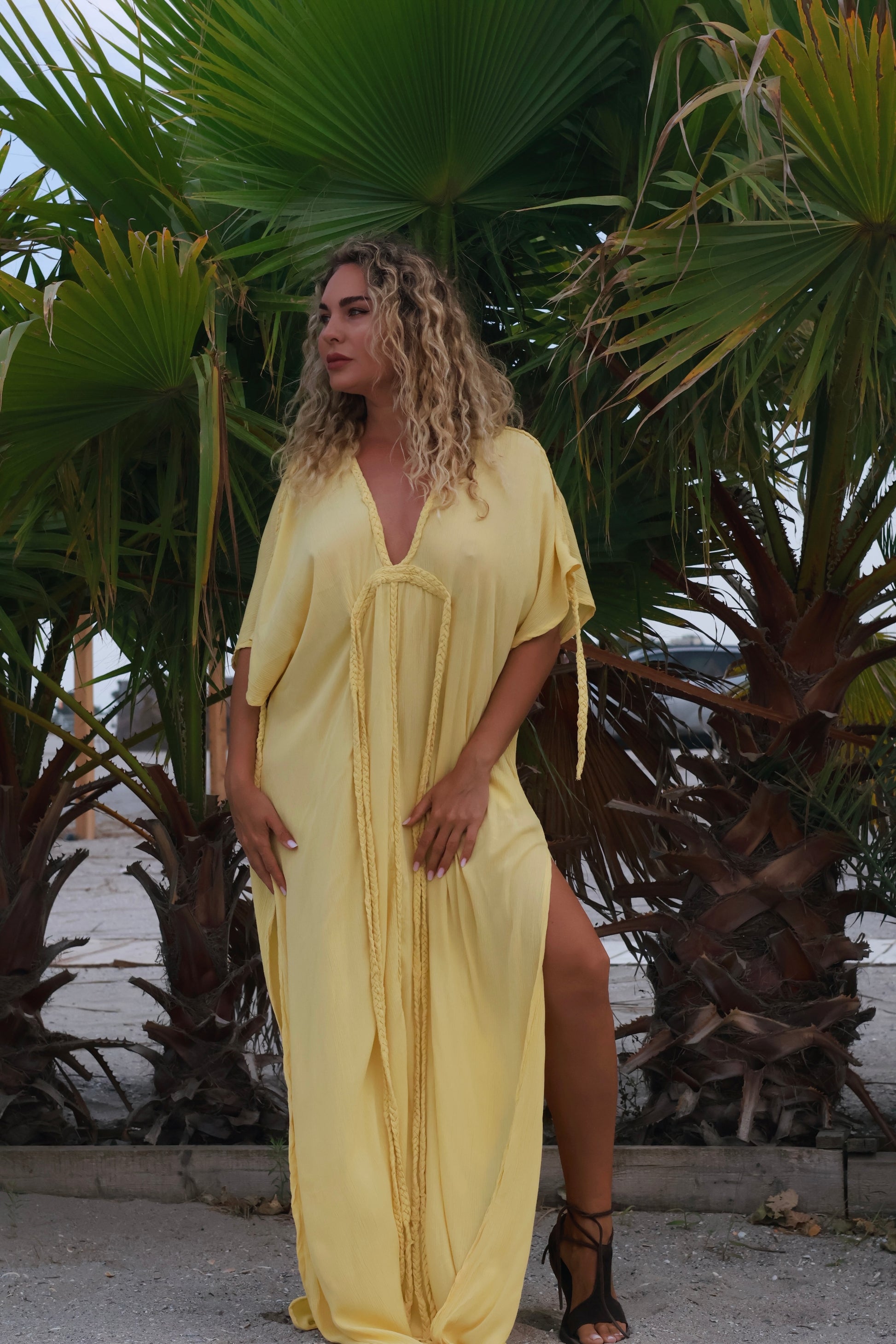 Rochia are croială universală, adaptabilă diverselor tipuri de siluetă. Cordoanele împletite manual pot fi ajustate pentru a sublinia talia, modifica lungimea sau transforma stylingul în funcție de ocazie.