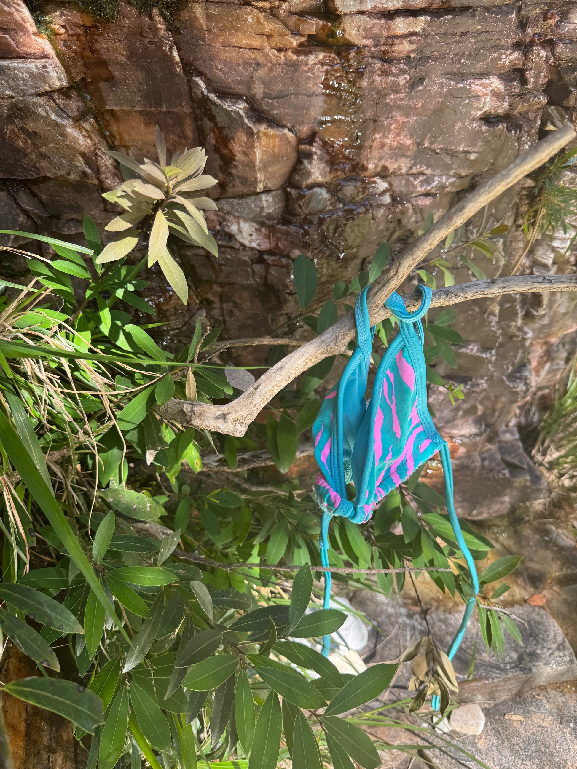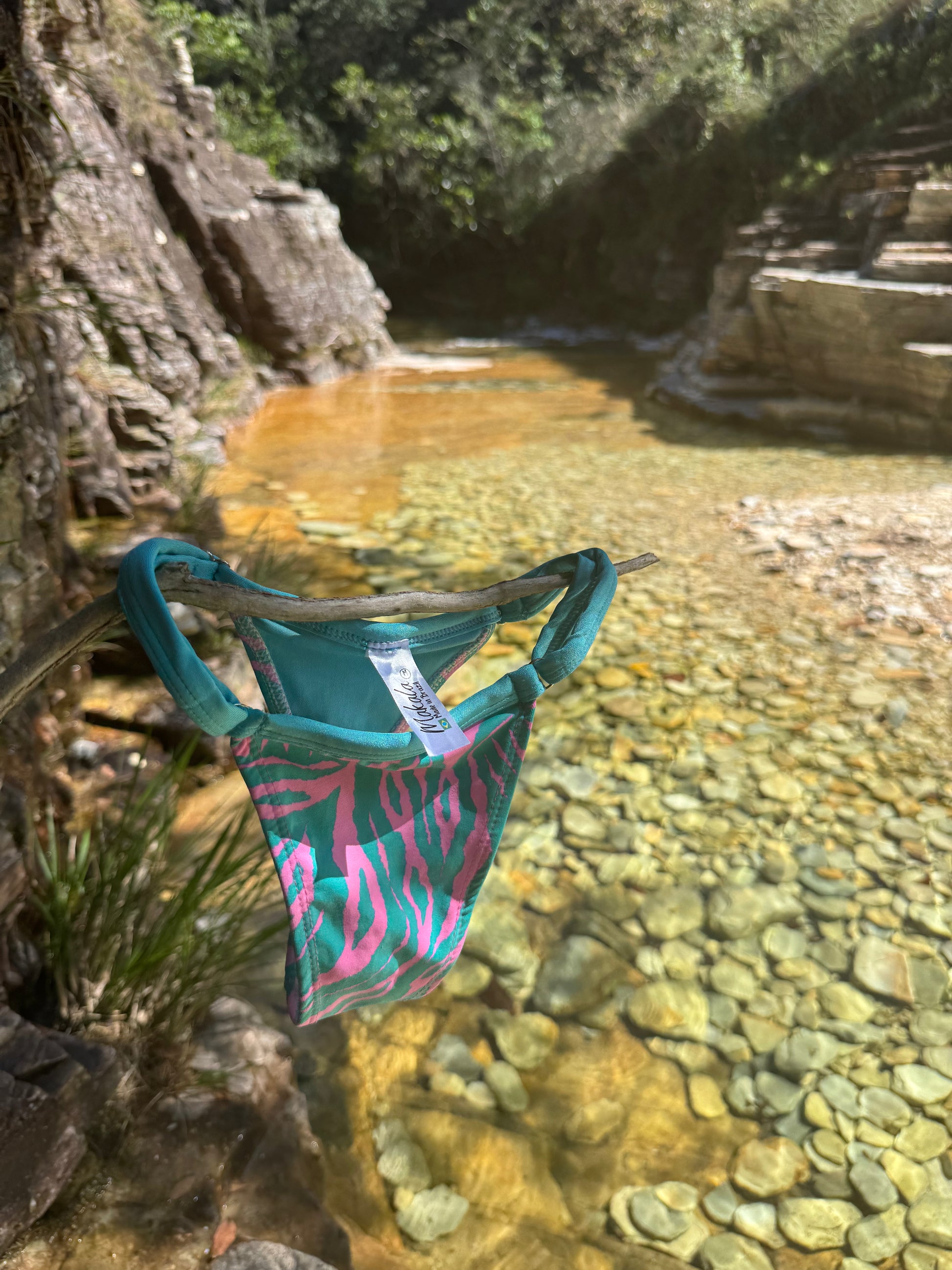 Blue Mirrage este un costum de baie cu top triunghi și slip tanga cu reglaj lateral elegant, realizat din material premium, moale și elastic. Cu un print zebrat artistic în tonuri de turcoaz vibrant, acest costum creează un efect optic spectaculos și pune bronzul în valoare. Inspirat de energia și culoarea carnavalurilor braziliene, Blue Mirrage îți oferă o apariție memorabilă pe plajă sau la piscină.
