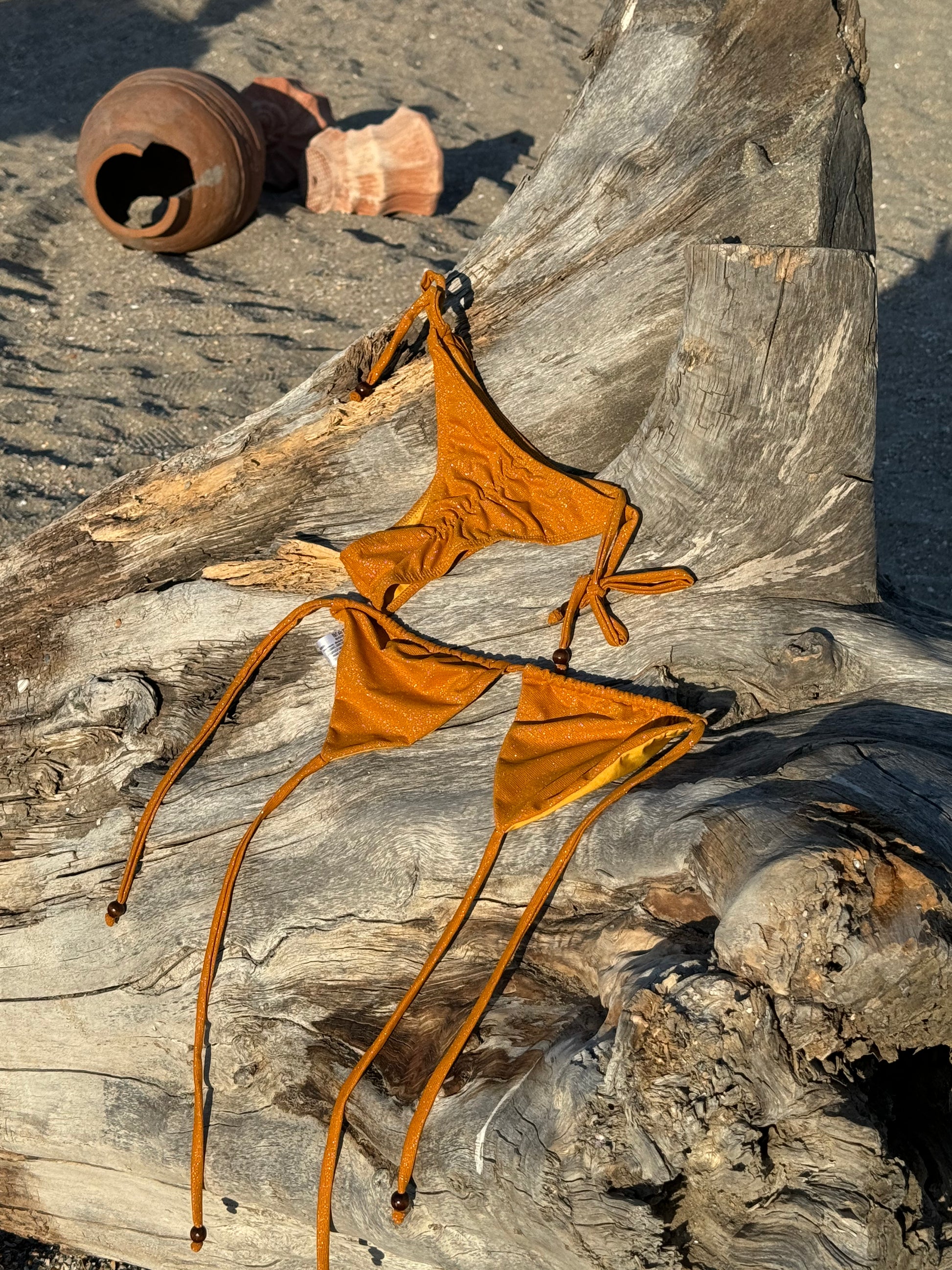 Strălucește subtil și sofisticat cu Setul Glitter, creat pentru momentele în care vrei să te simți cu adevărat specială. Slipul cu efect push-up posterior evidențiază delicat formele, conturând o siluetă fermecătoare, în timp ce materialul sclipitor, cu textură fină și mătăsoasă, captează lumina naturală și pune bronzul în valoare.