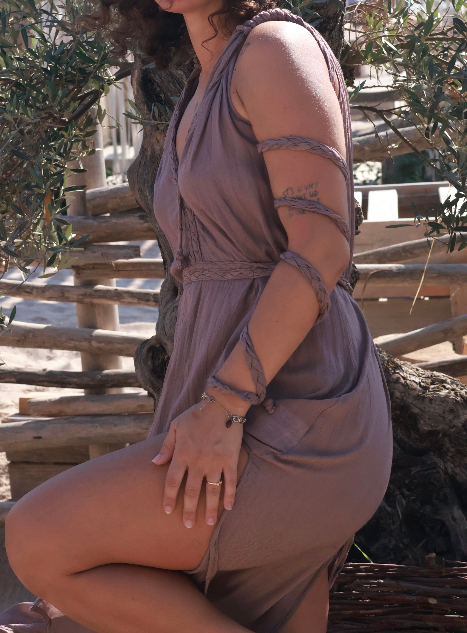 Inspirată de siluetele atemporale ale Greciei Antice, această rochie este o reinterpretare modernă a eleganței clasice. Confecționată manual din 100% vâscoză naturală, ultra-respirabilă și delicată la atingere, piesa se distinge prin fluiditatea materialului și prin croiala amplă, ce urmează linia corpului cu naturalețe.