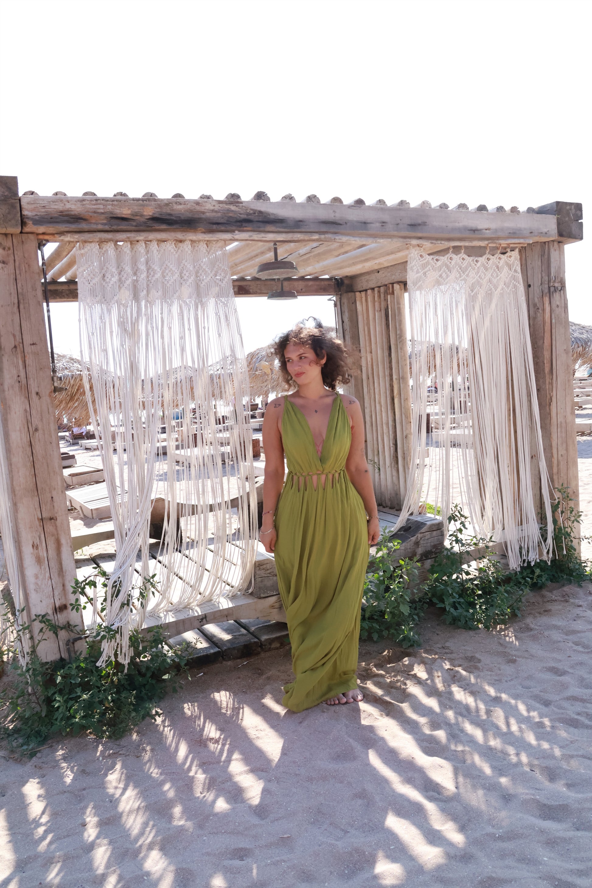 Materialul vaporoas și mișcarea fluidă a rochiei se completează cu decupaje sexy în talie, care conturează elegant linia corpului. Închiderea este realizată printr-un nasture plasat discret la spate, pe linia bustului, detaliu care fixează partea superioară fără a strânge sub piept, păstrând lejeritatea și confortul.