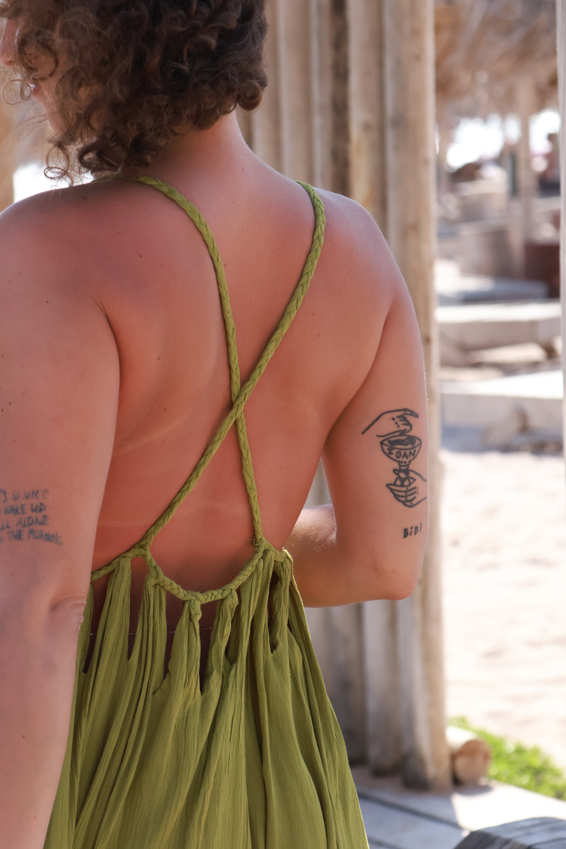 Rochia are croială universală, adaptabilă diverselor tipuri de siluetă. Cordoanele împletite manual pot fi ajustate pentru a sublinia talia, modifica lungimea sau transforma stylingul în funcție de ocazie.