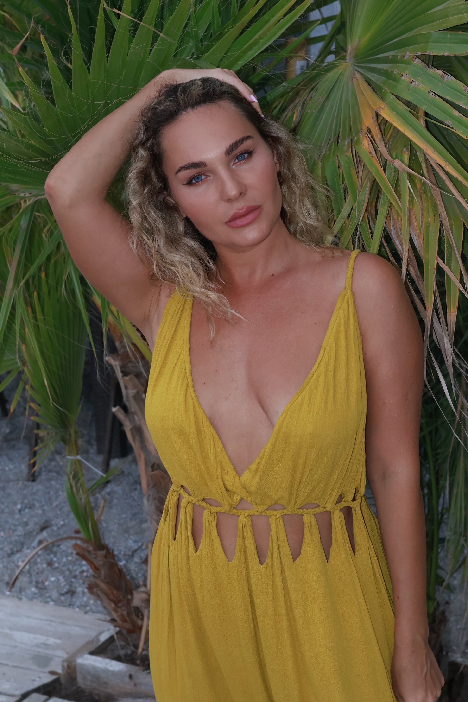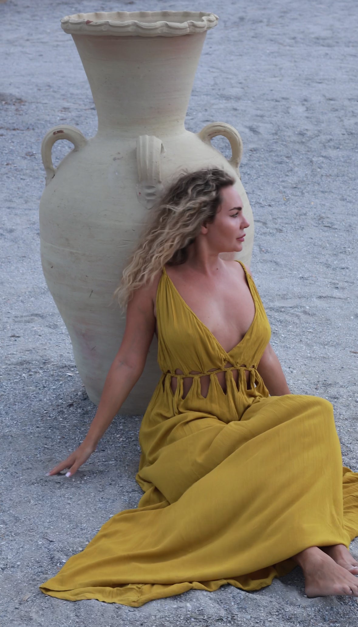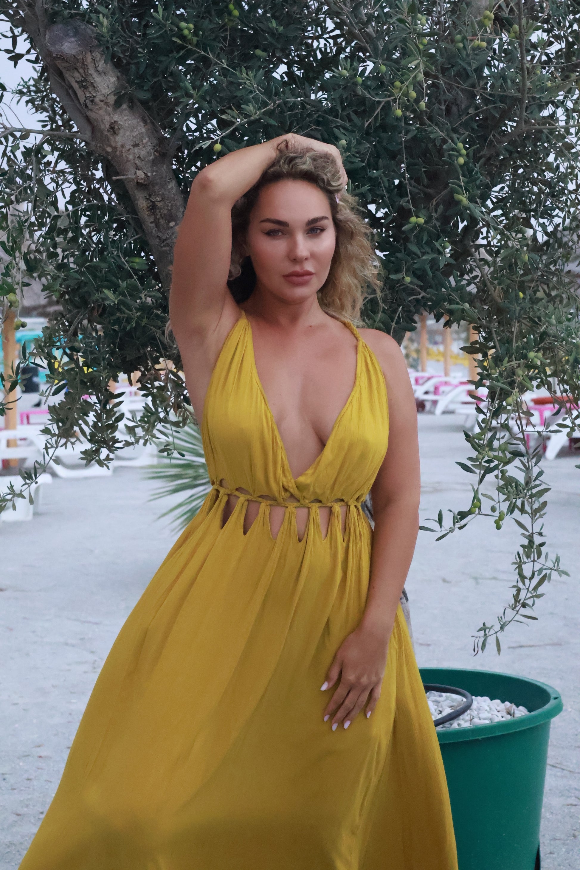 Materialul vaporoas și mișcarea fluidă a rochiei se completează cu decupaje sexy în talie, care conturează elegant linia corpului. Închiderea este realizată printr-un nasture plasat discret la spate, pe linia bustului, detaliu care fixează partea superioară fără a strânge sub piept, păstrând lejeritatea și confortul.