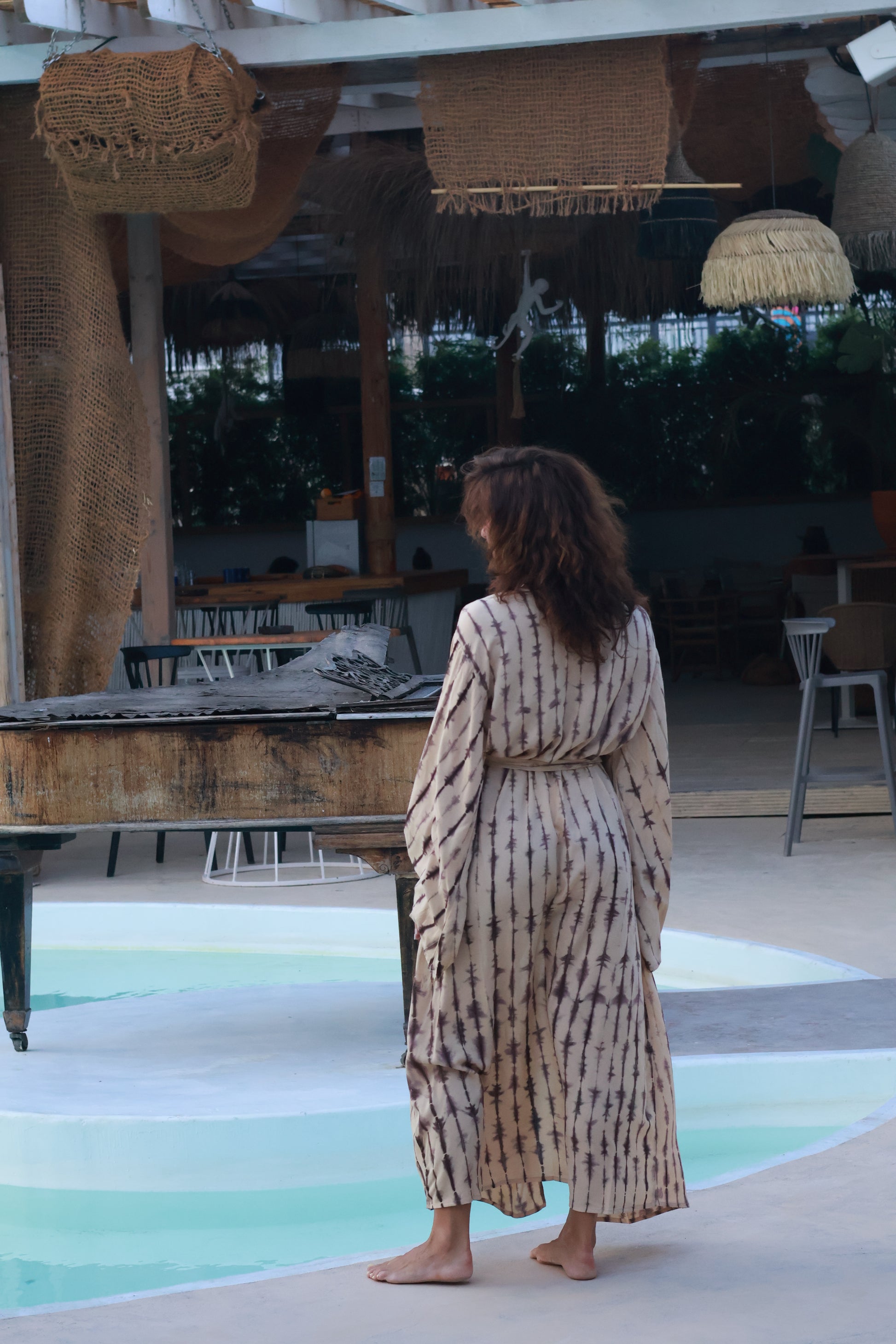 Croiala amplă, cu mâneci lungi și fluide, oferă libertate de mișcare și un aer sofisticat, în timp ce buzunarele laterale adaugă funcționalitate discretă. Poate fi purtat atât peste un costum de baie, cât și ca piesă statement într-o ținută urbană.
