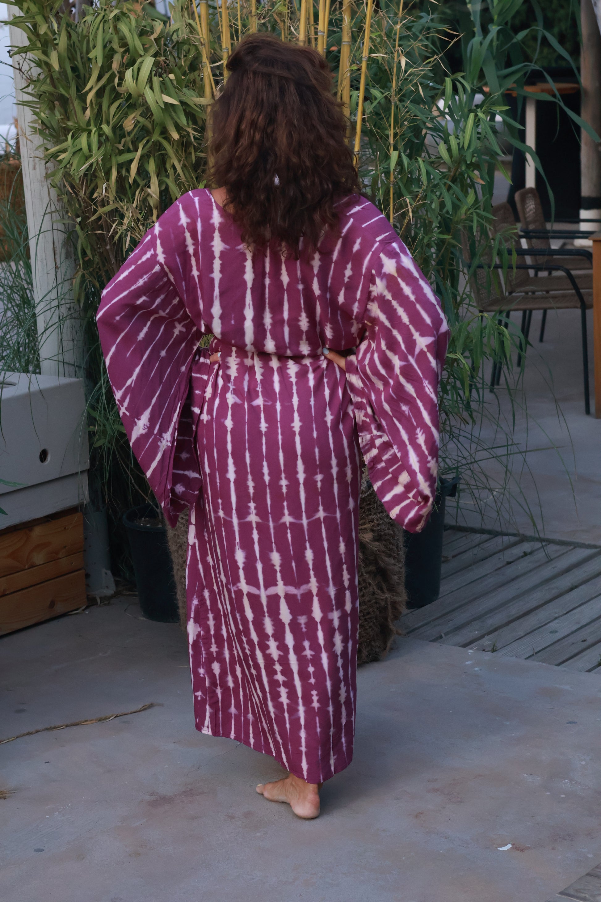 Kimonoul are mărime universală (XS–L), cu croială lejeră și cordon reglabil care poate evidenția talia sau fi purtat liber.