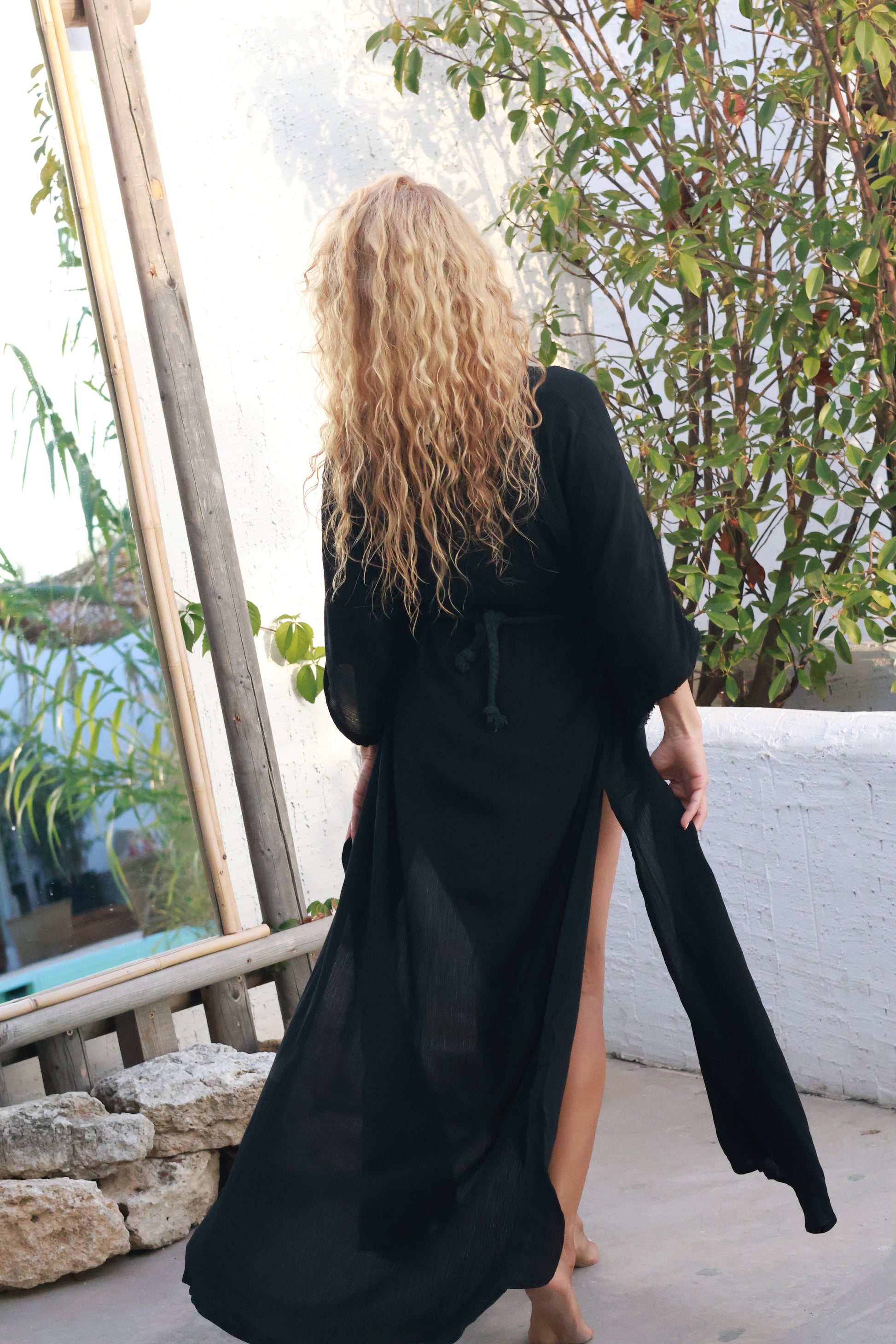 Un kimono realizat manual în India, din vâscoză naturală, lejeră și răcoritoare, ideală pentru zilele de vară. Materialul fin și croiala fluidă îl transformă într-o piesă versatilă și sofisticată. Fiecare kimono este vopsit manual, ceea ce îi conferă un aspect unic, iar cordonul împletit manual accentuează talia cu eleganță.Despicăturile laterale și textura vaporosă oferă libertate de mișcare și un aer relaxat, perfect pentru vacanțe sau ținute de zi cu zi.Cum poate fi purtat: