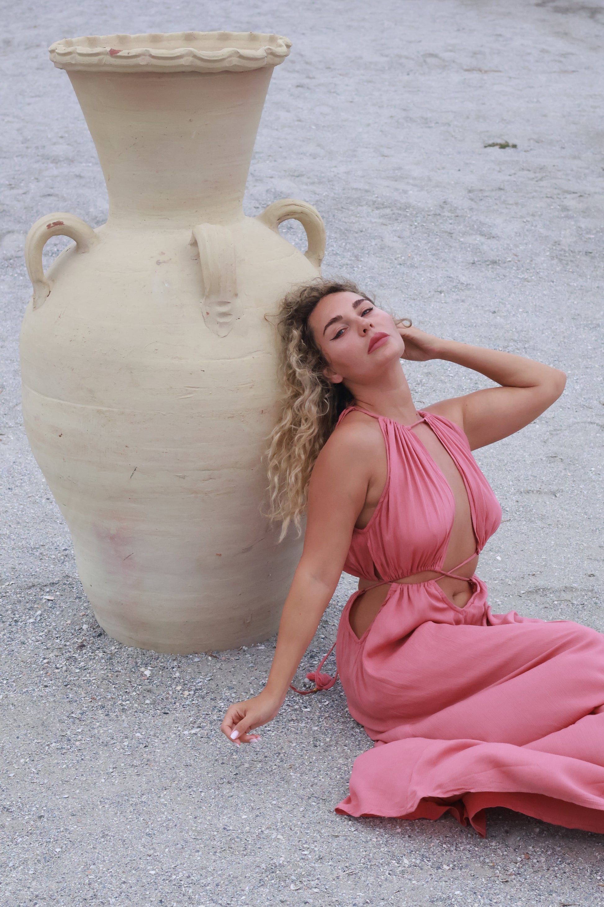 Rochia handmade Nyssa celebrează feminitatea liberă și senzualitatea subtilă. Croiala cu decupaje elegante subliniază silueta și adaugă un aer seducător, fără să piardă din fluiditatea naturală a materialului.