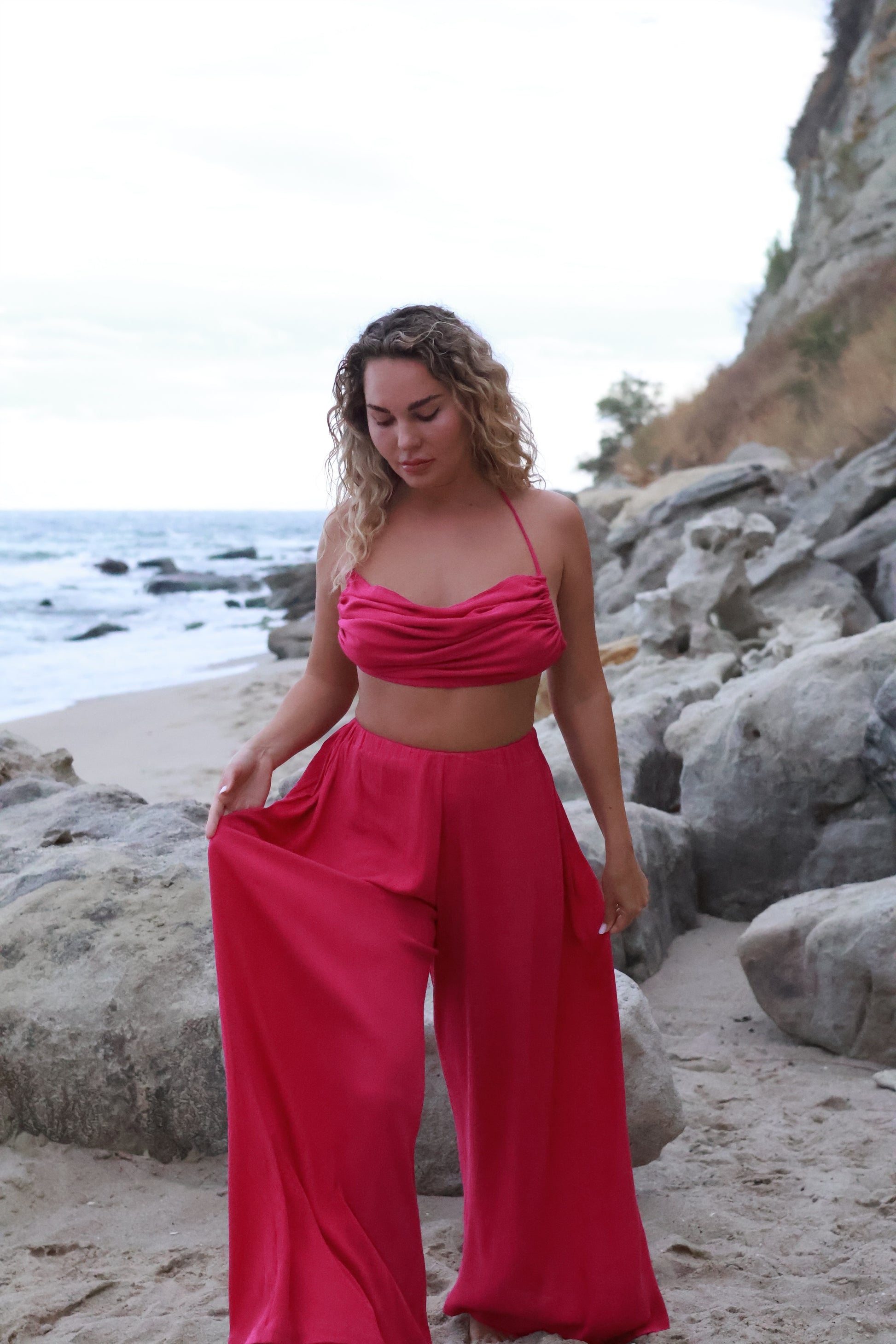 - Pantaloni – mărime universală (XS–L), cu croială lejeră și talie comodă. Materialul fluid îi face potriviți pentru zile călduroase, dar și pentru ținute boeme de seară.