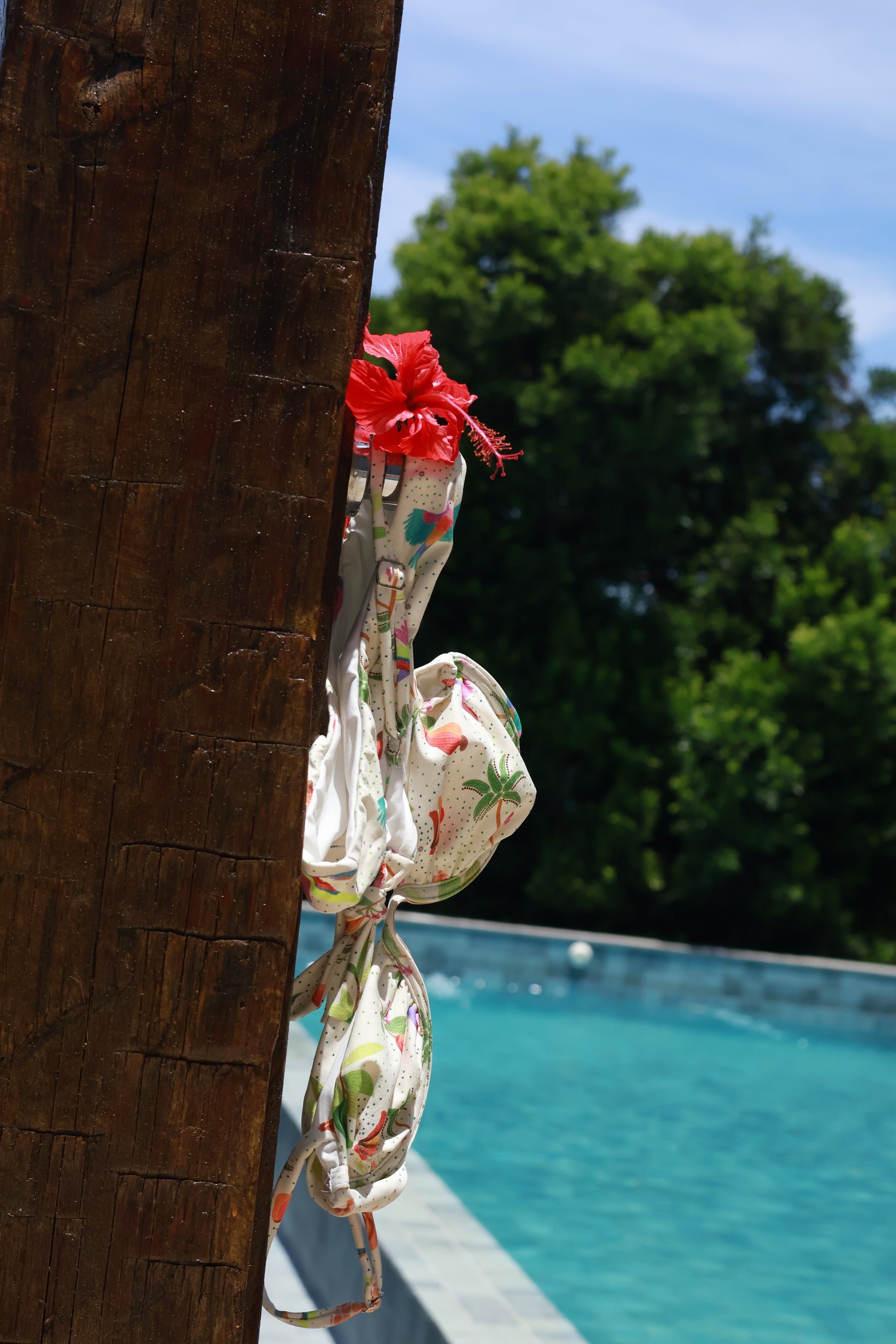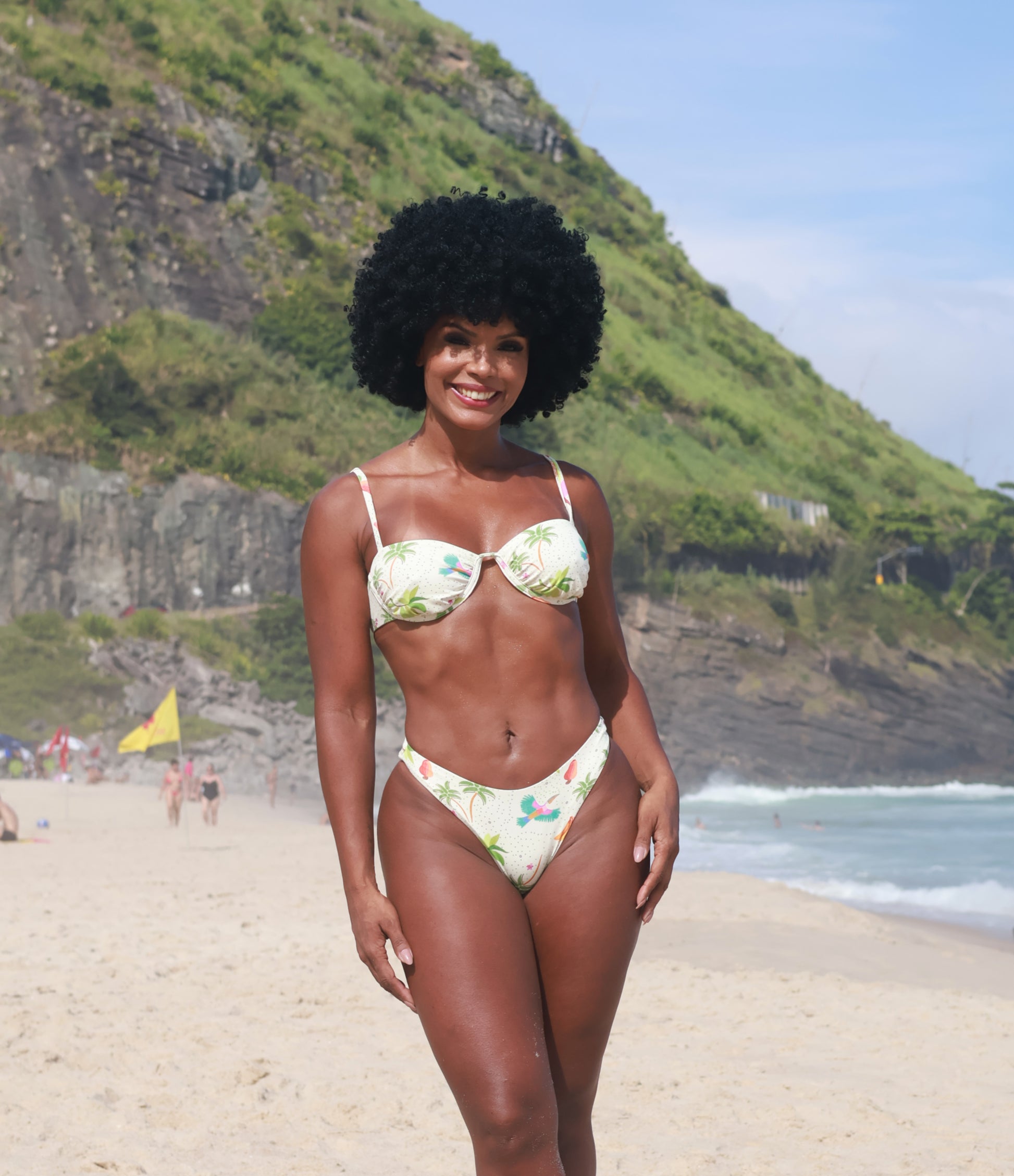 Costumul de baie 2 piese Tropical Bahia te poartă direct în inima Braziliei, printre umbre de palmieri și parfum de flori tropicale. Topul balconette cu arc interior susține delicat bustul, conturând un decolteu feminin și rafinat. Cu un imprimeu inspirat din jungla amazoniană, pe o bază off-white luminoasă, acest costum de baie îmbină exoticul cu eleganța subtilă.