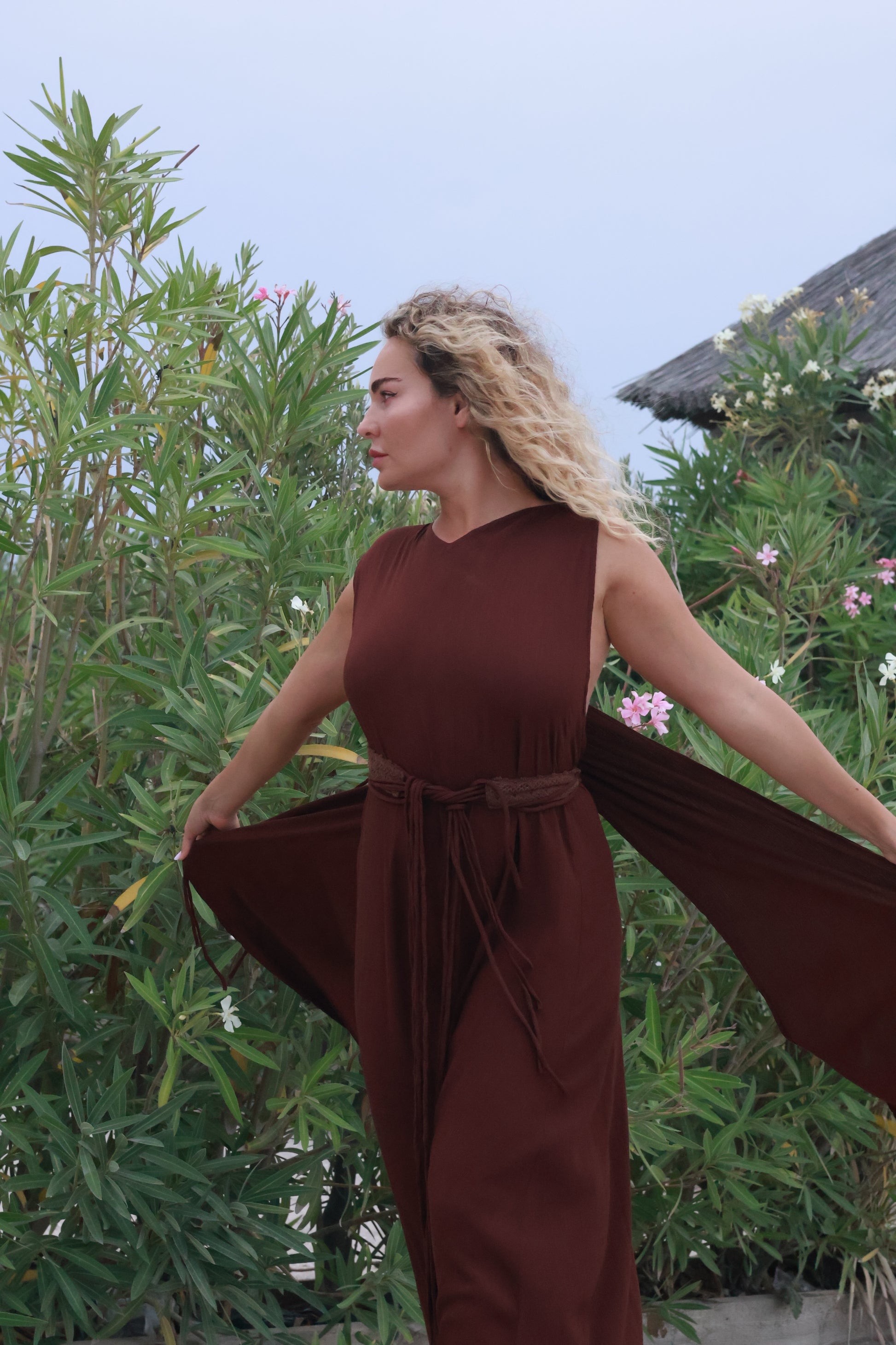 Rochia are mărime universală (XS–L), adaptabilă datorită croiului lejer și detaliilor de legare la spate și pe brațe. Se așază fluid pe corp și poate fi ajustată discret în zona taliei sau bustului. Ideală pentru siluete care apreciază libertatea de mișcare și un look natural, fără constrângeri.